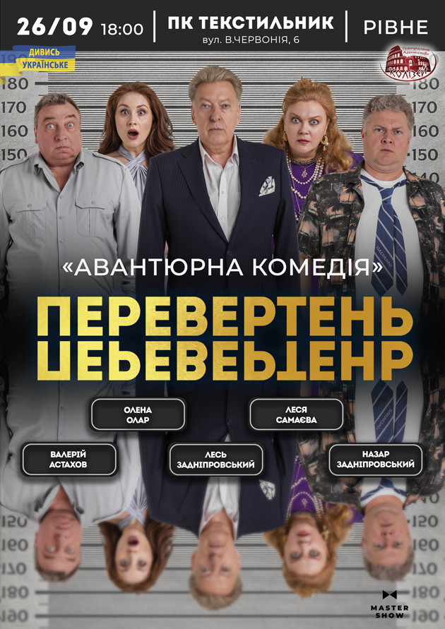 Продюсерський центр Колізей з гордістю запрошує на прем’єру сезону — «ПЕРЕВЕРТЕНЬ» За мотивами культового фільму Френка Оза *«Відчайдушні шахраї»* Хто він — таємничий Перевертень? Любов і жага грошей, пристрасті та інтриги, гострий гумор і несподівані повороти сюжету — все це вибухне на сцені за 2 години (з антрактом)! Ви сміятиметеся, дивуватиметеся і ловитимете себе на думці: *«А чи правильно я здогадуюсь, хто тут кого перехитрив?»* Чому це треба побачити саме зараз: * Неймовірна хімія акторів і яскраві емоції на сцені; * Дотепні діалоги, які підкорять навіть найвибагливішу публіку; * Театр, що дарує драйв, сміх і післясмак свята. Зірковий склад: * Олександр — Народний артист України Лесь Задніпровський * Едуард — Народний артист України Назар Задніпровський * Анжеліка Мартинівна — Заслужена артистка України Леся Самаєва * Вероніка — акторка театру та кіно Олена Олар * Григорій — Заслужений артист України Валерій Астахов Режисер-постановник: Валерій Астахов Художник-постановник: Дмитро Лук’яненко Продюсер: Олег Шпанчук Присутність — суворо обов’язкова. Інші вистави можна побачити потім. Цю — потрібно побачити зараз! Встигніть забронювати місце на детективно-комедійну сенсацію театрального сезону!